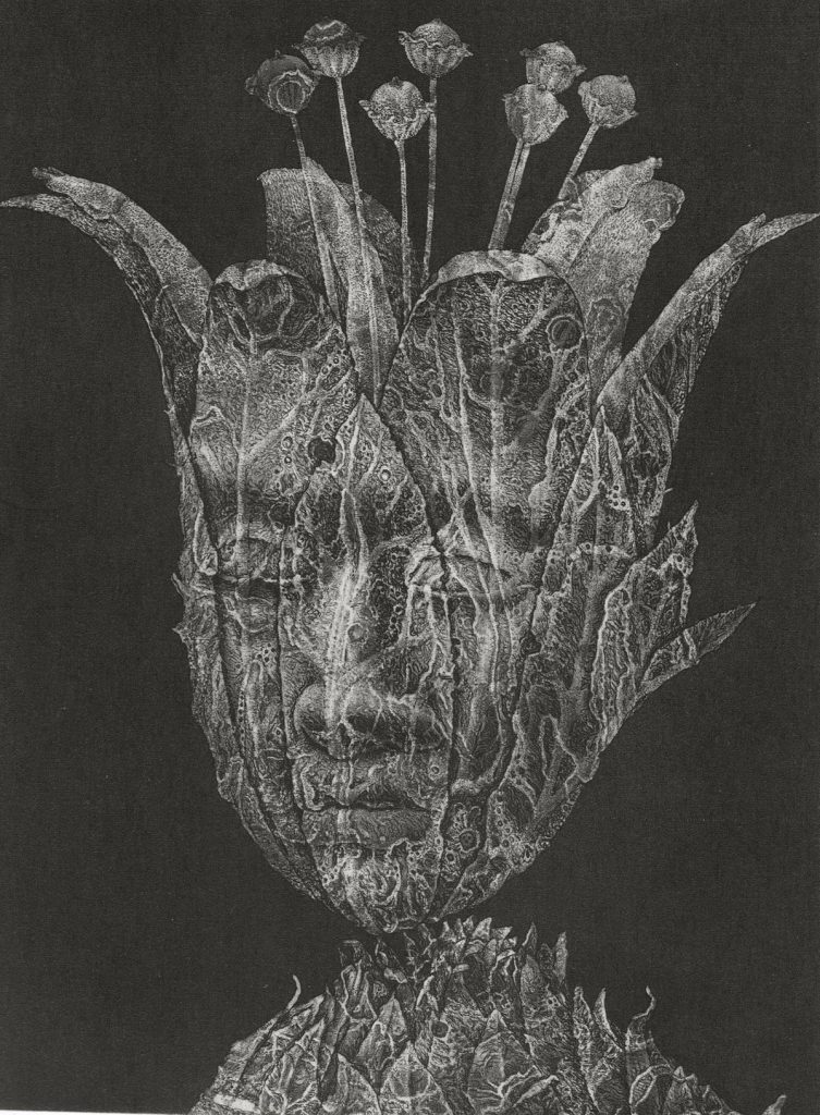 Alla teos Miniprint Finland 2010 -näyttelystä, Sakuta Tomiyukin etsaus-akvatinta Kevät tyttö.