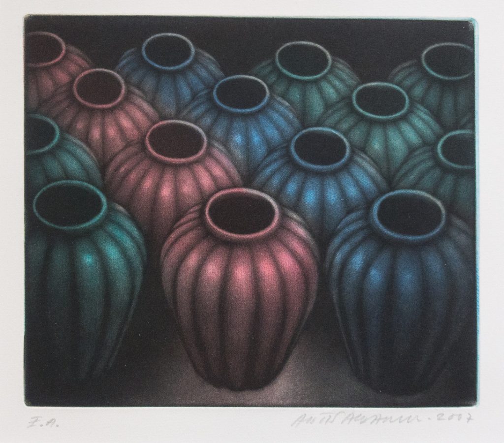 Työskentelyn lähtökohdaksi sopivat valokuvat, piirustukset sekä erilaiset kuvamateriaalit. Kurssi sopii metalligrafiikan perusteet hallitseville. Opettaja Vappu Johansson. Hinta 140 € (+materiaalikulut) – Alla Vappu Johanssonin teos sarjasta Heavy and light.