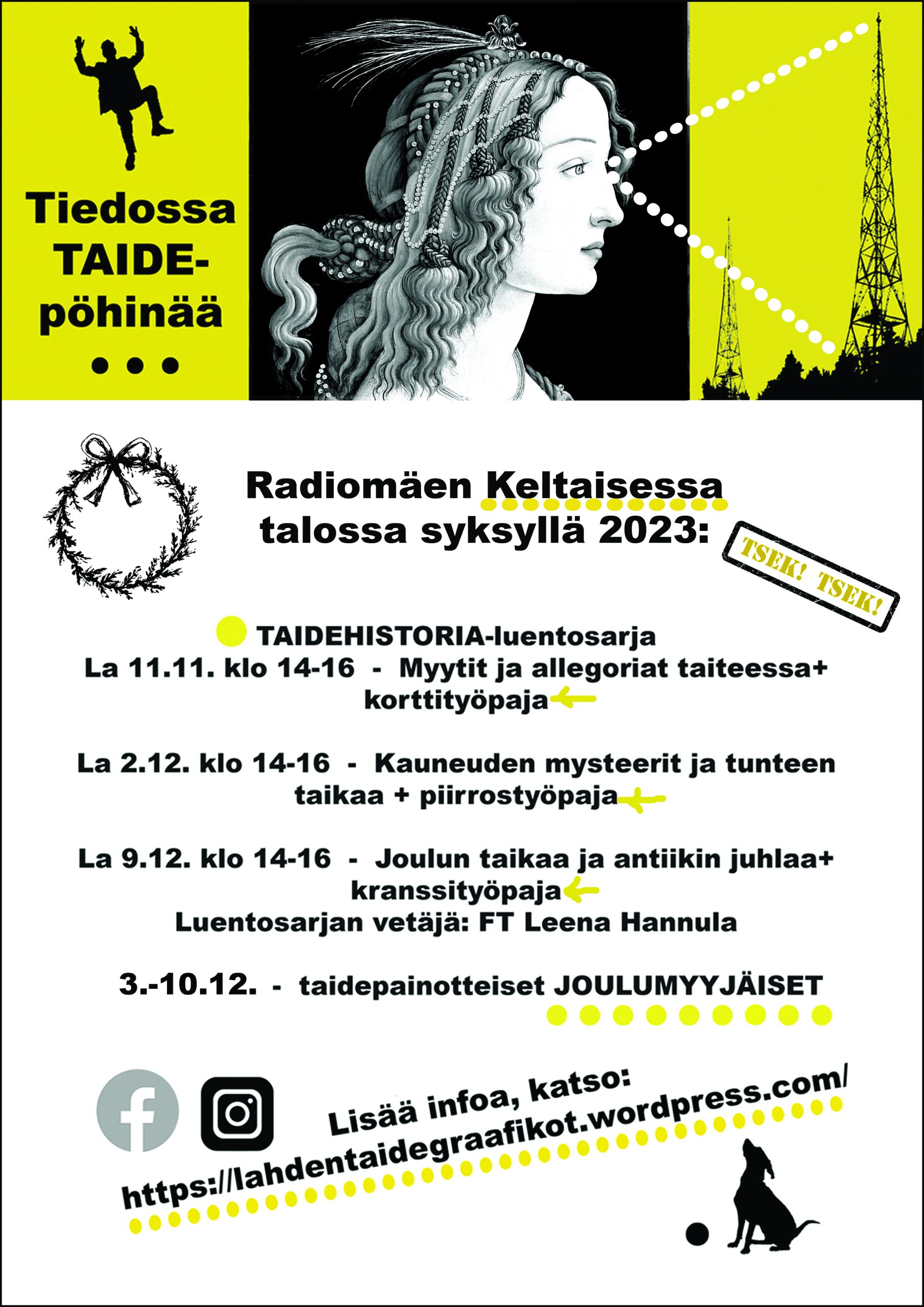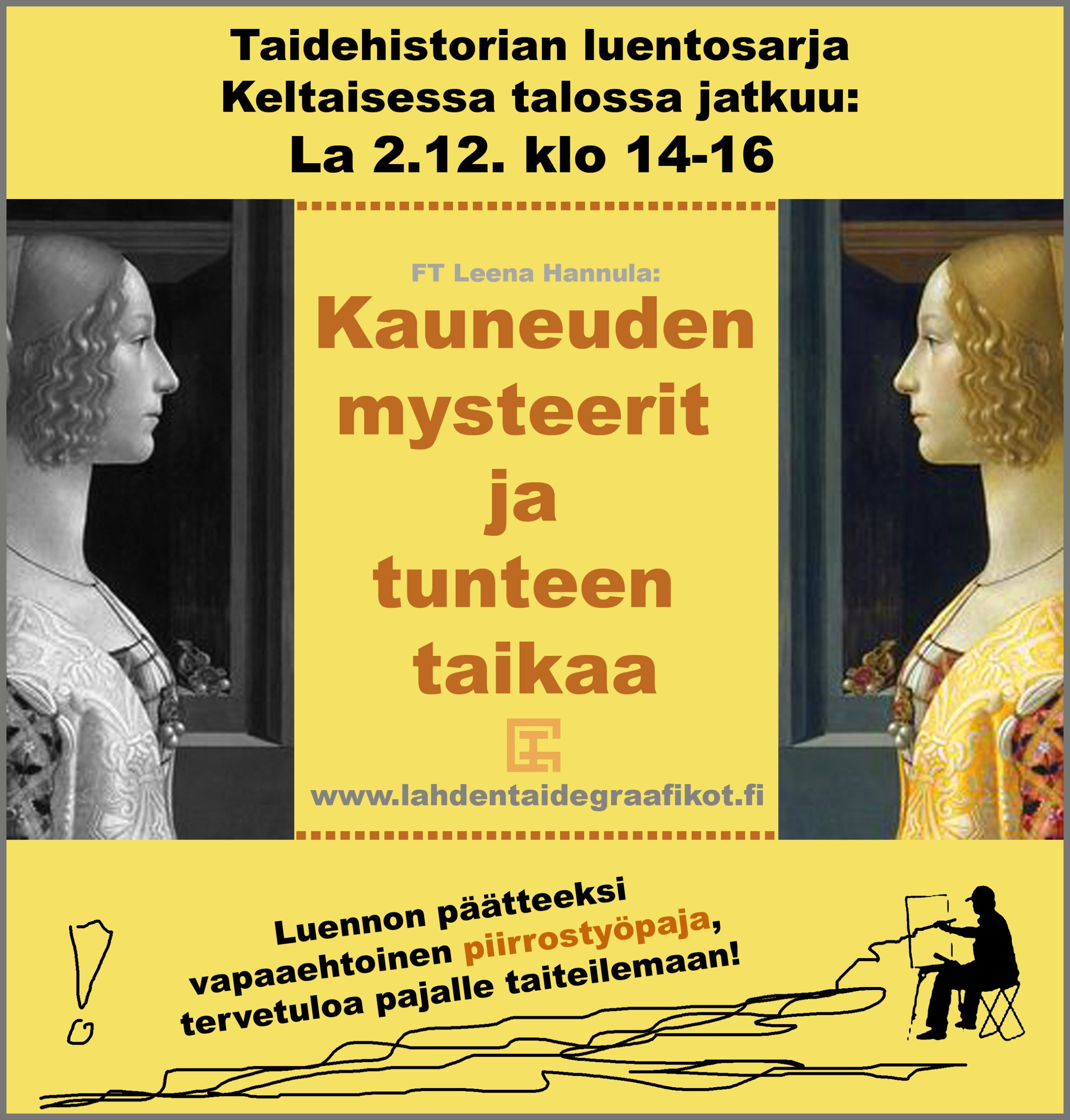Pe 21.4. klo 11 – 12.30 Keltainen talo. Lahti Cityn kanssa järjestetty tapahtuma ”Piristävä perjantai senioreille”. Luento Oi aikoja, oi tapoja! Aloita päiväsi reippaasti kapuamalla Radiomäelle, paikka on Keltainen talo, Radiomäenkatu 43. Muoti, ruoka- ja tapakulttuuri ovat synnyttäneet aina keskustelua. Tutkimme luennolla maalausten muotokieltä renessanssista nykypäivään myös keskustelevan kuvantarkastelun menetelmällä. Osallistumismaksu aikuiset 10€. Opettaja FT Leena Hannula.