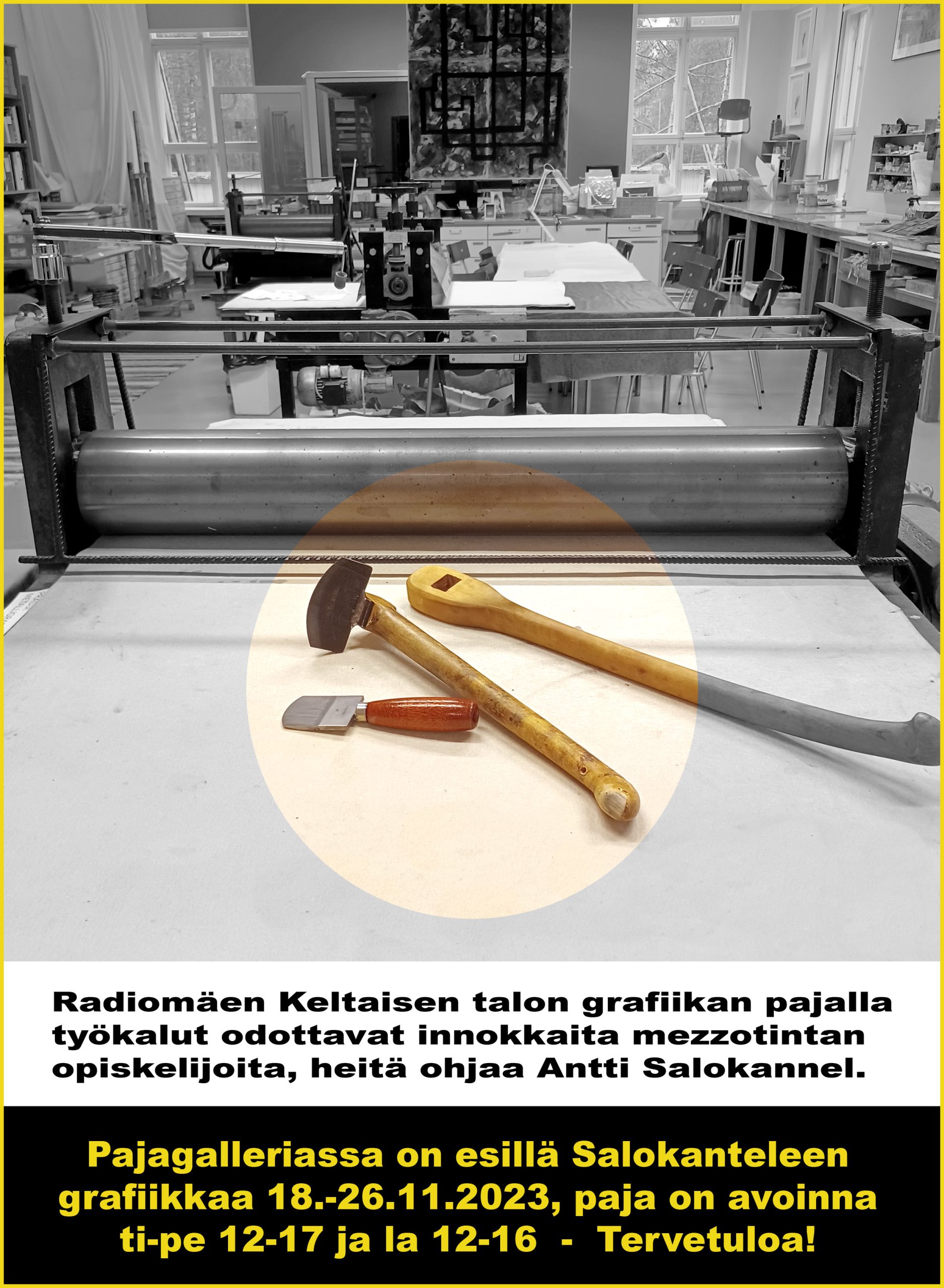 18.-19.11. ja 25.-26.11. klo 10-17 ”Mezzotinta”. Kurssin tarkoituksena on perehdyttää opiskelija mezzotinta-menetelmään taidegrafiikan ilmaisumuotona. Kurssilla opiskellaan sekä painolaatan valmistusta, rouhimista ja työstämistä painolaataksi että vedostamista. Opettaja Antti Salokannel. Hinta 160 €.